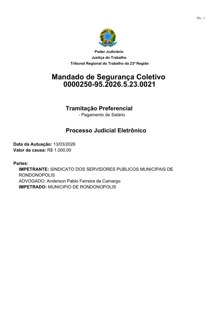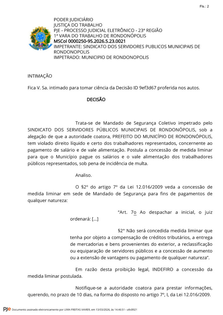 A Justiça do Trabalho negou nesta sexta feira (13) o pedido de decisão liminar que obrigaria o pagamento imediato de salários e vale-alimentação aos trabalhadores da Companhia de Desenvolvimento de Rondonópolis (CODER) em até 24h.