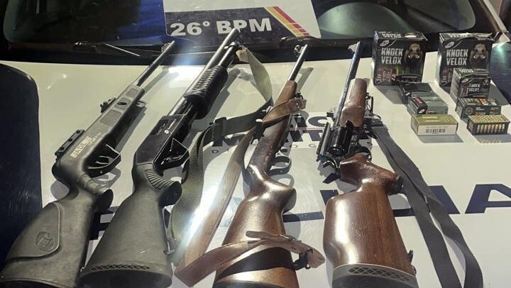 Nas buscas, os militares localizaram uma arma longa de calibre .12, uma espingarda de calibre .22 e outra de calibre .36, uma espingarda de pressão e 249 munições para todo o armamento.